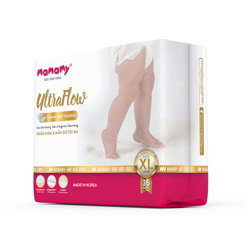 Bỉm tã dán Ultraflow Mamamy XL36 (12-17kg) với 3 cải tiến ưu việt và 3 cấu tạo ưu việt để giúp bé ngừa hăm và mẩn đỏ tối đa nhất. Công nghệ tiên tiến của Hàn Quốc được kết hợp với các loại nguyên liệu cao cấp, cải tiến cao hơn nữa để tạo sự nhẹ nhàng, khô thoáng và thấm hút nhất.