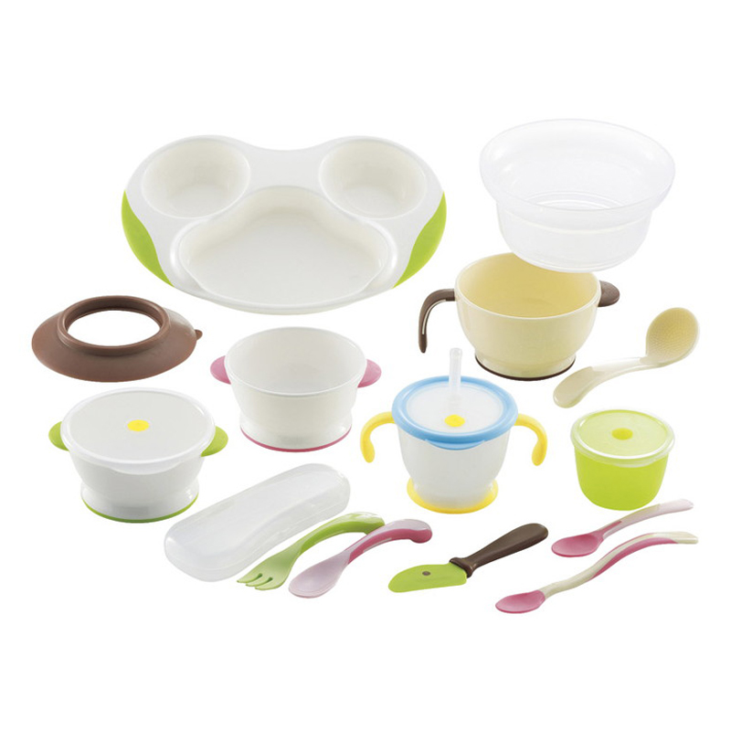 - Bộ sản phẩm gồm: 1 bát ăn có nắp, 1 bát ăn cơm, 1 khay ăn 3 ngăn, 1 cốc nấu cháo/cơm nát trong lò vi sóng, 1 cốc 1 tay cầm, 1 cốc tập uống 3 giai đoạn, 1 hộp đựng đồ ăn nhỏ, 1 dụng cụ cắt mỳ, 2 thìa ăn, 1 bộ thìa dĩa tập ăn và 1 thìa nghiền.