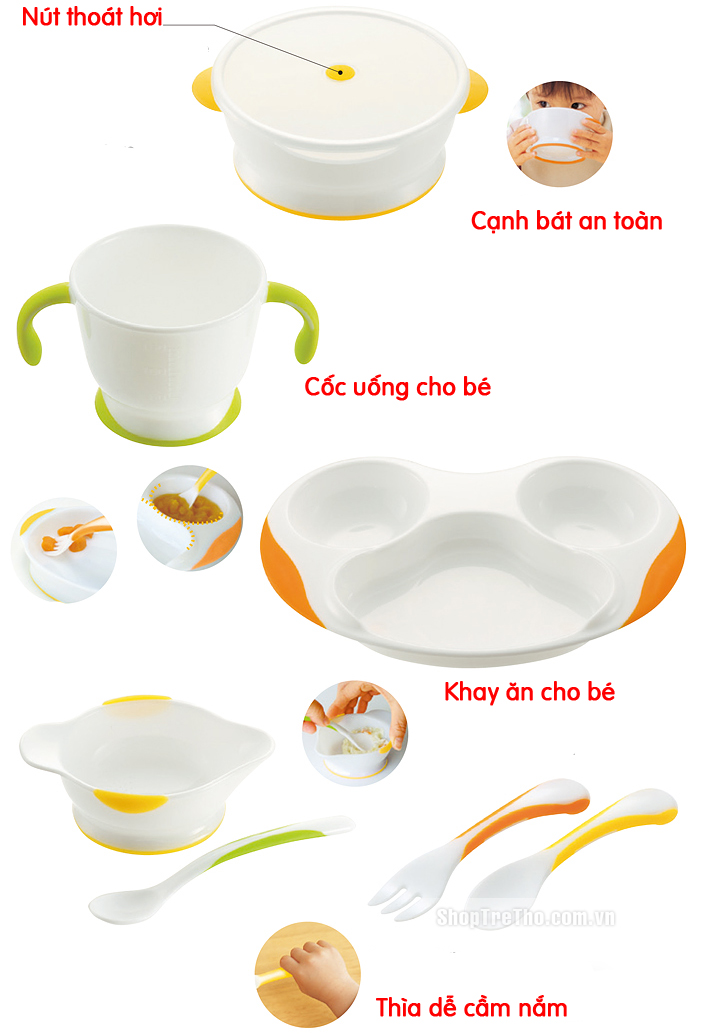Các loại bát, cốc và thìa đều được thiết kế sao cho giống với chiếc bát ăn của người lớn nhất để bé học cách làm quen với những đồ dùng ăn uống ngay từ khi còn sớm một cách an toàn nhất và dễ dàng nhất.