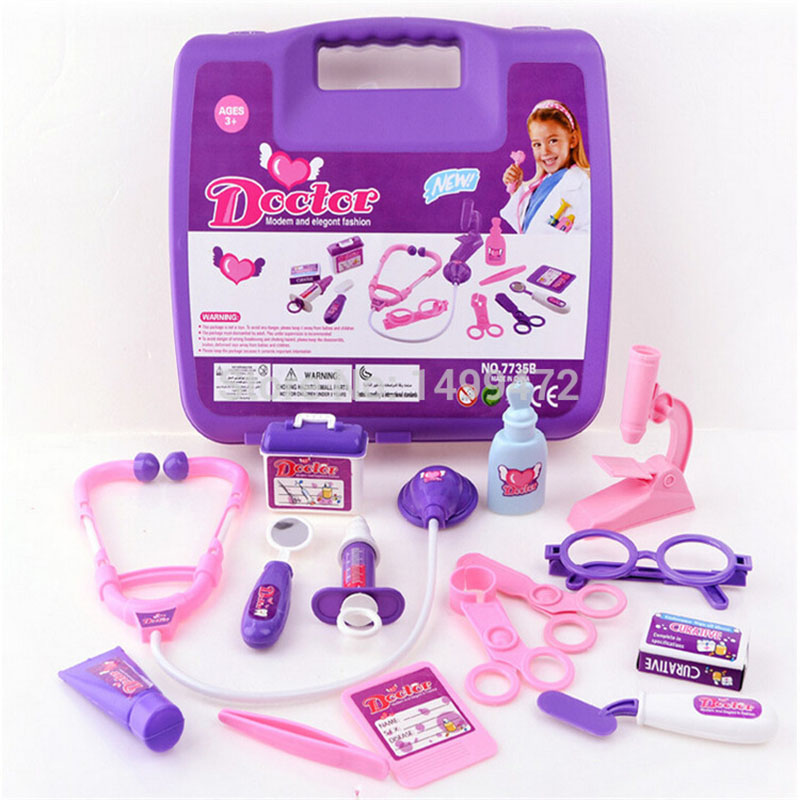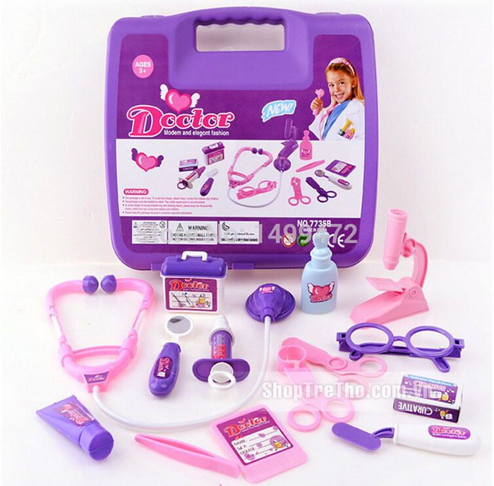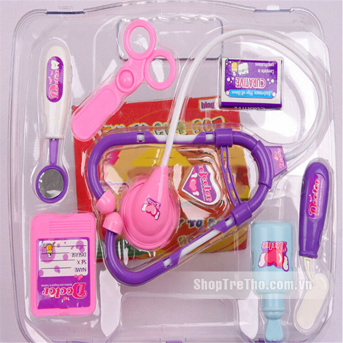 - Bộ đồ chơi bác sĩ gồm: 1 vali đựng đồ, các món đồ cho bé khám bệnh gồm: ống nghe, đèn nội soi tai mũi họng, kim tiêm, lọ thuốc, kính bác sĩ…