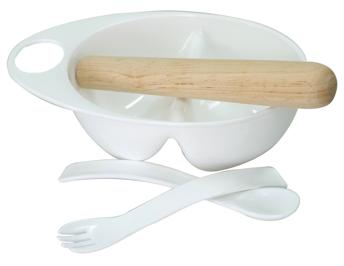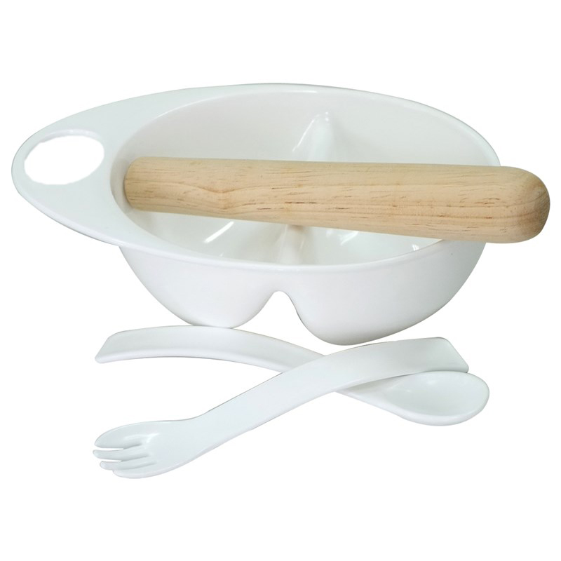 Quy cách: Một bộ gồm một chén ăn, muỗng ăn, dĩa ăn và chày để nghiền thức ăn đi kèm.