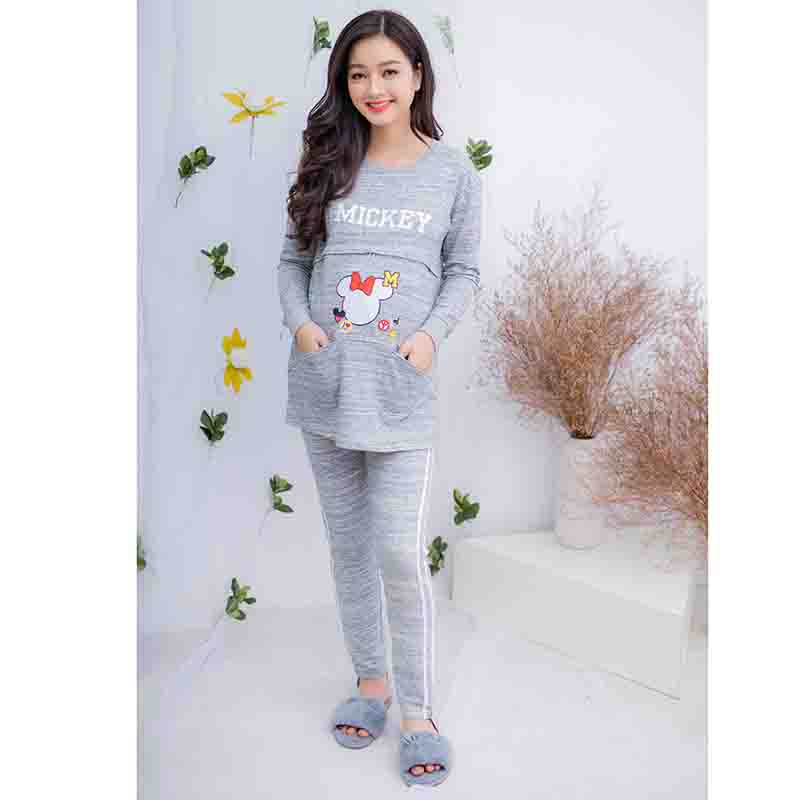 Bộ bầu cho bé bú in hình Mickey Emum (xám lợt) với thiết kế có khóa mở để mẹ bầu có thể cho bé ti dễ dàng mà vẫn đảm bảo kín đáo. Sản phẩm được may từ chất vải nỉ da cá đảm bảo giữ nhiệt, tránh việc "gió máy" cho các mẹ sau sinh, tránh bị bệnh hậu sản.