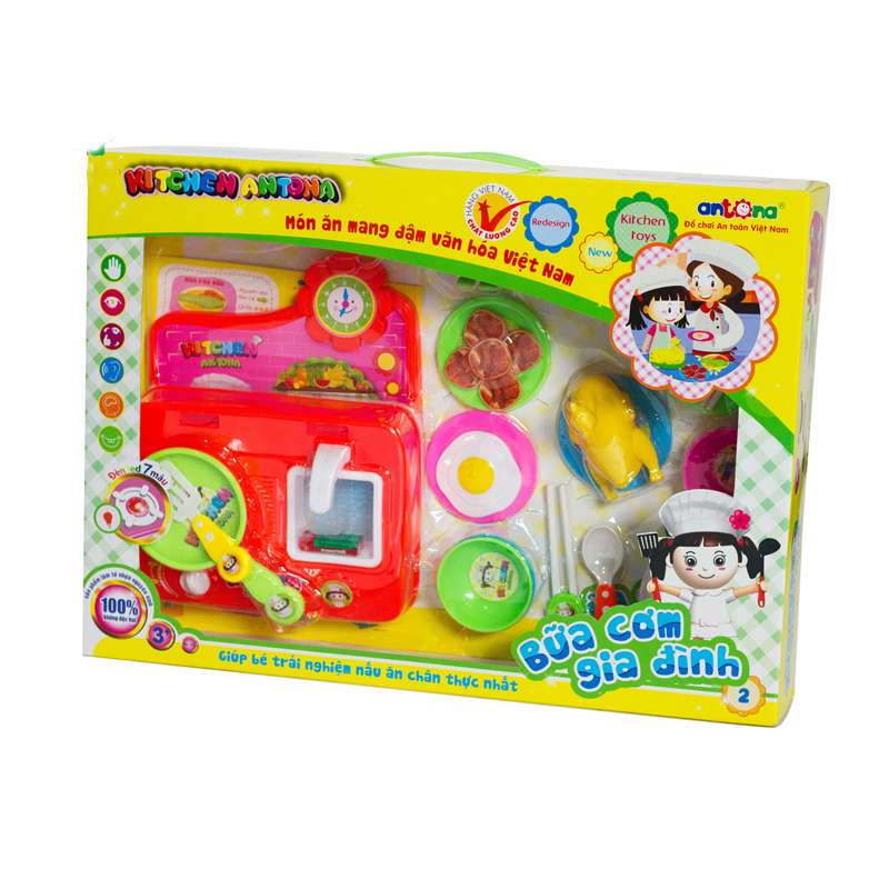 Bộ bếp Antona No.252B - Bữa cơm gia đình 2 gồm các chi tiết như bếp nấu, nồi, bát đĩa, đũa, dao...cùng các món ăn được làm từ chất liệu nhựa nguyên sinh an toàn. Bộ đồ chơi giúp bé chơi trò nấu ăn thú vị, đồng thời giúp bé hiểu hơn về các món ăn trong bữa cơm gia đình Việt.