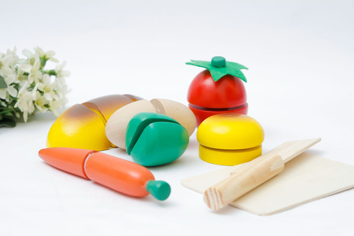 - Bộ cắt hoa quả gồm 8 món: Bánh mì, bánh hamburger, ớt, cà rốt, cà chua, trứng, dao và thớt.