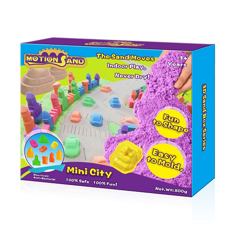 Bộ chơi cát Motion Sand - Mô hình thành phố nhỏ với 800g cát + 10 khuôn nhựa hình: ô tô, nhà cửa...để bé có thể xây dựng nên một thành phố cát ngay trong nhà. Sản phẩm sử dụng cát động học với 98% cát biển tự nhiên, không dính tay dễ tạo hình khối nên mẹ yên tâm cho các bé trên 3 tuổi chơi nhé.