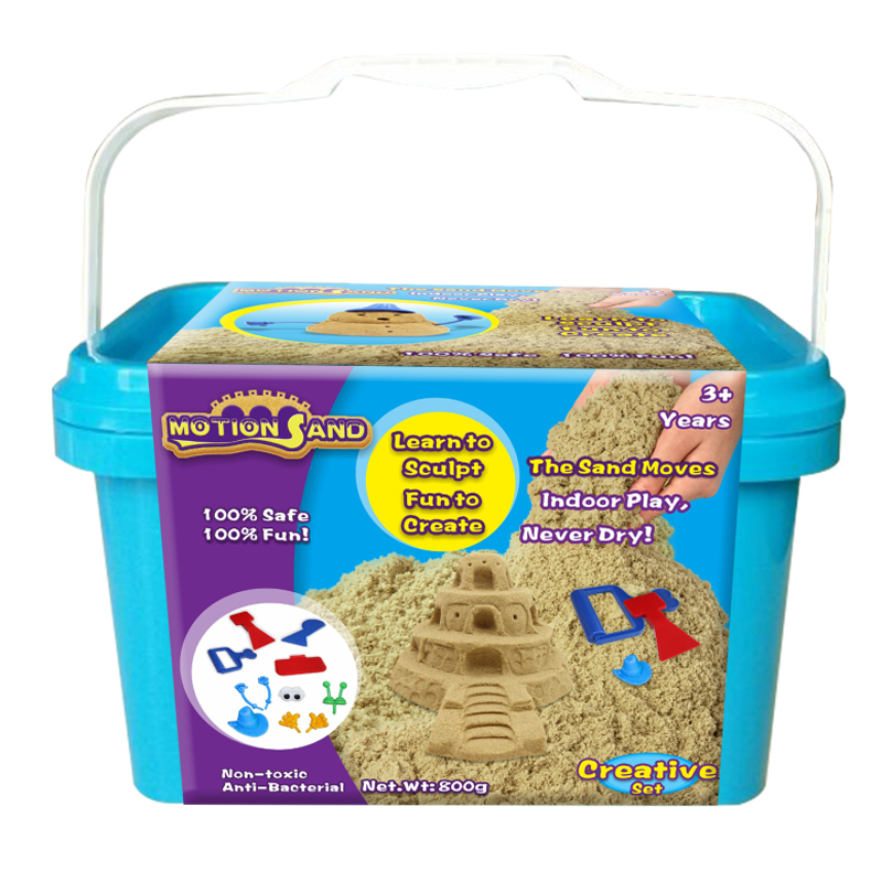 - Bộ sản phẩm gồm có: 800g cát tạo hình + 4 khuôn, 5 phụ kiện trang trí, đựng trong hộp nhựa màu