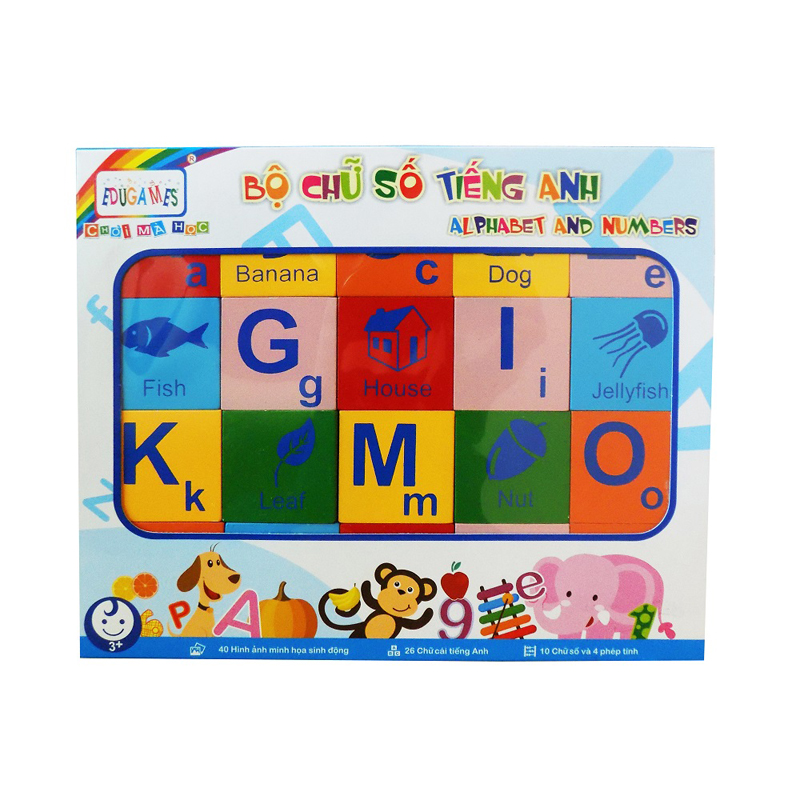 Với chất gỗ tự nhiên, bộ chữ và số tiếng Anh Edugames GA672 sẽ món quà ý nghĩa dành tặng cho các bé trên 3 tuổi. Tất các các chữ cái, chữ số cùng dấu toán (cộng, trừ, bằng) với 2 cách viết (viết hoa và viết thường) có từ tiếng anh đi kèm sẽ giúp bé làm quen, học chữ, đếm số tốt hơn.
