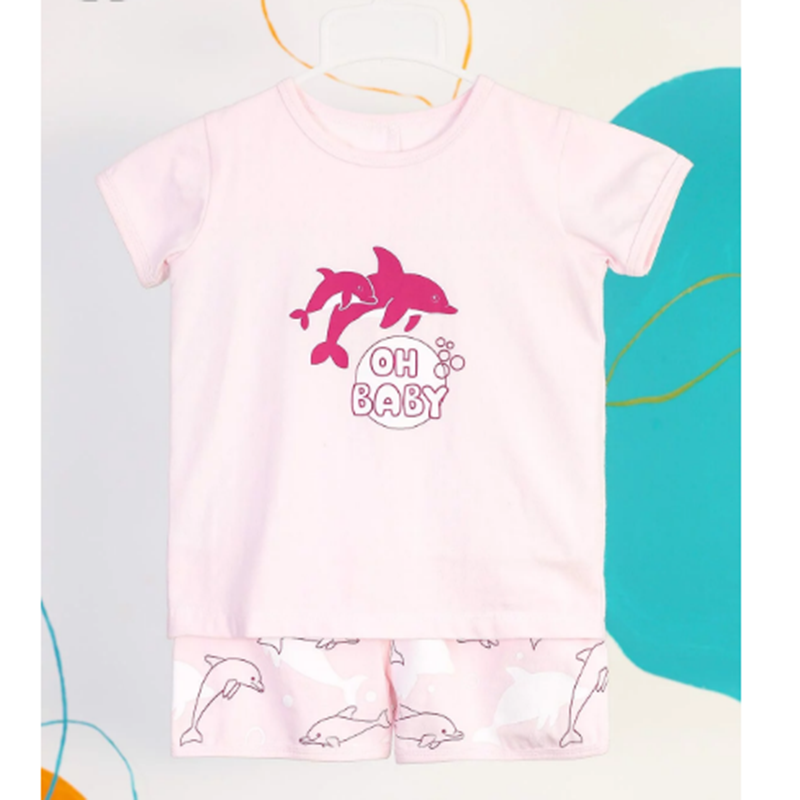 - Họa tiết in hình cá heo và chữ "Oh Baby" nổi bật trên nền hồng pastel