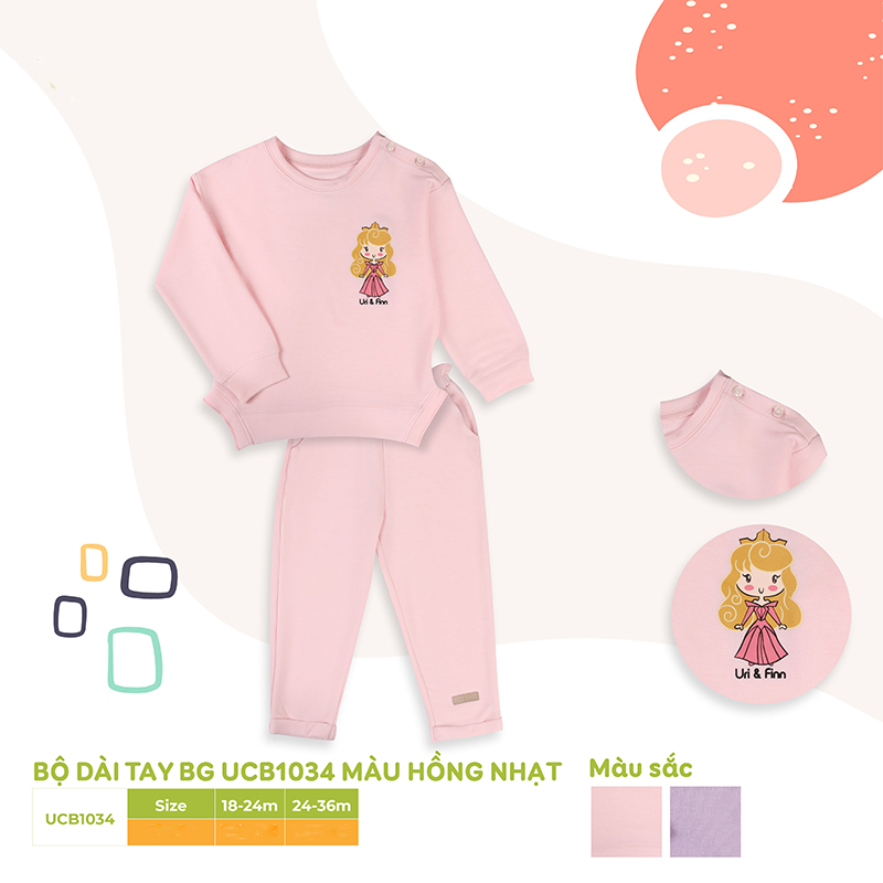 Bộ dài tay cài vai Uri&Finn BG UCB1034 (hồng nhạt) với chất liệu Cotton siêu mềm mịn, co giãn, không xù, không nhăn, thấm hút mồ hôi hiệu quả cùng hoạ tiết công chúa đội vương miệng dễ thương và đáng yêu cho bé.