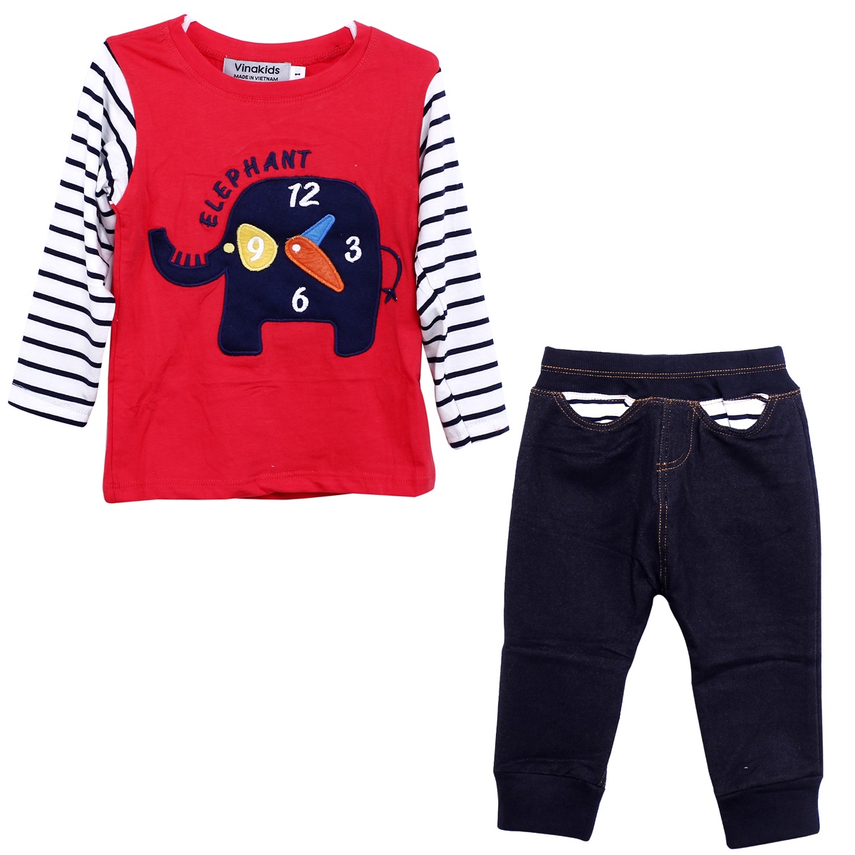 - Bộ đồ bé trai Vinakids họa tiết con voi với thiết kế áo dài và quần dài ấm áp, dành riêng cho bé trai từ 1 - 8 tuổi.