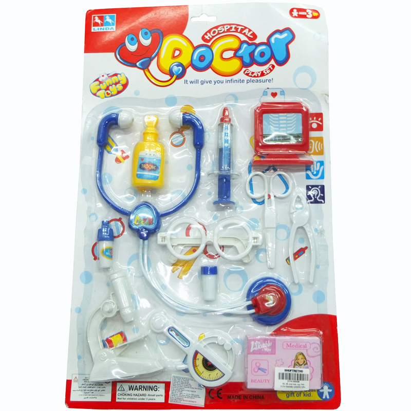 - Bộ đồ chơi làm bác sĩ gồm nhiều dụng cụ để bé có thể hóa thân thành bác sĩ như: hộp đựng dụng cụ, thuốc, ống nghe hai đầu hình quả dâu nhìn rất đáng yêu, nhíp, và giọt thuốc, bông thấm, kim tiêm, dao mổ...