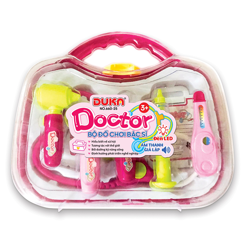 Bộ đồ chơi bác sĩ có đèn báo Duka 660-25 giúp bé hóa thân thành bác sĩ tham gia khám chữa bệnh cho mọi người. Bộ đồ chơi không chỉ giúp bé nhận biết các dụng cụ y tế như kim tiêm, nhiệt kế,... mà còn hình thành thói quen sống vệ sinh, từ đó giáo dục nhận thức về y tế và sức khỏe.