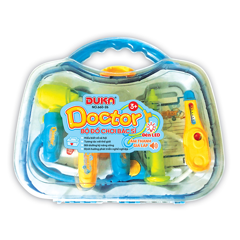 Sử dụng chất liệu nhựa an toàn, bộ đồ chơi bác sĩ có đèn báo Duka 660-26 giúp bé hóa thân thành bác sĩ tham gia khám chữa bệnh cho mọi người. Bộ đồ chơi không chỉ giúp bé nhận biết các dụng cụ y tế như kim tiêm, nhiệt kế,... mà còn hình thành thói quen sống vệ sinh, từ đó giáo dục nhận thức về y tế và sức khỏe.