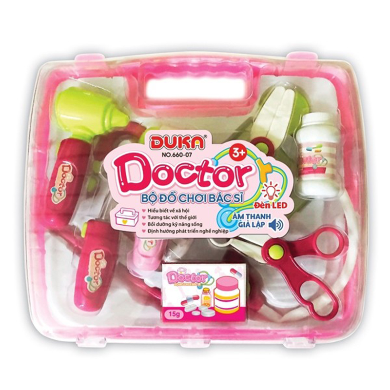 Bộ đồ chơi bác sĩ có đèn Duka No.660-07 được thiết kế mô phỏng các dụng cụ y tế như: ống nghe, kim tiêm, các chai thuốc...để bé có thể đóng vai thành bác sĩ chữa bệnh. Thông qua việc chơi đùa, bé sẽ phát triển khả năng vận động, trí tưởng tượng, đồng thời giúp bé bớt cảm giác sợ sệt, lo lắng khi đi chích ngừa, khám bệnh.