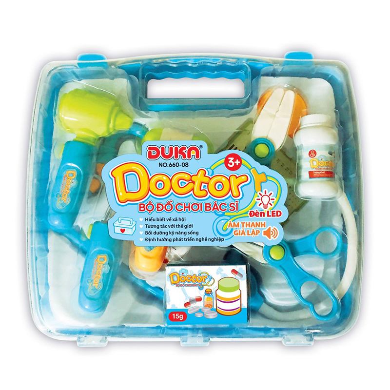 Bộ đồ chơi bác sĩ có đèn Duka No.660-08 với thiết kế mô phỏng các dụng cụ y tế như: ống nghe, các chai thuốc...để bé có thể đóng vai thành bác sĩ chữa bệnh. Thông qua việc chơi đùa, bé sẽ phát triển khả năng vận động, trí tưởng tượng, đồng thời giúp bé bớt cảm giác sợ sệt, lo lắng khi đi chích ngừa, khám bệnh.