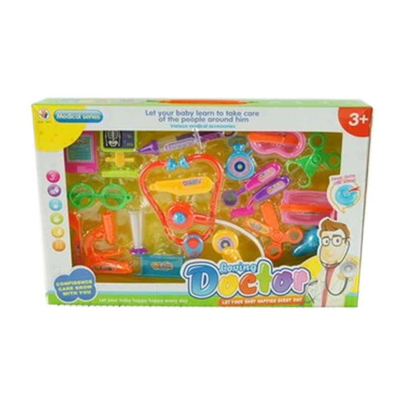 - Bộ đồ chơi bao gồm các dụng cụ thường dùng trong y tế như: ống nghe, mắt kính, ống tiêm, hộp thuốc..