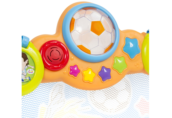 - Trên mặt khung thành là bộ trò chơi phát nhạc vui nhộn vơi nhiều nút bấm ngộ nghĩnh, màu sắc bắt mắt phù hợp với trẻ nhỏ.