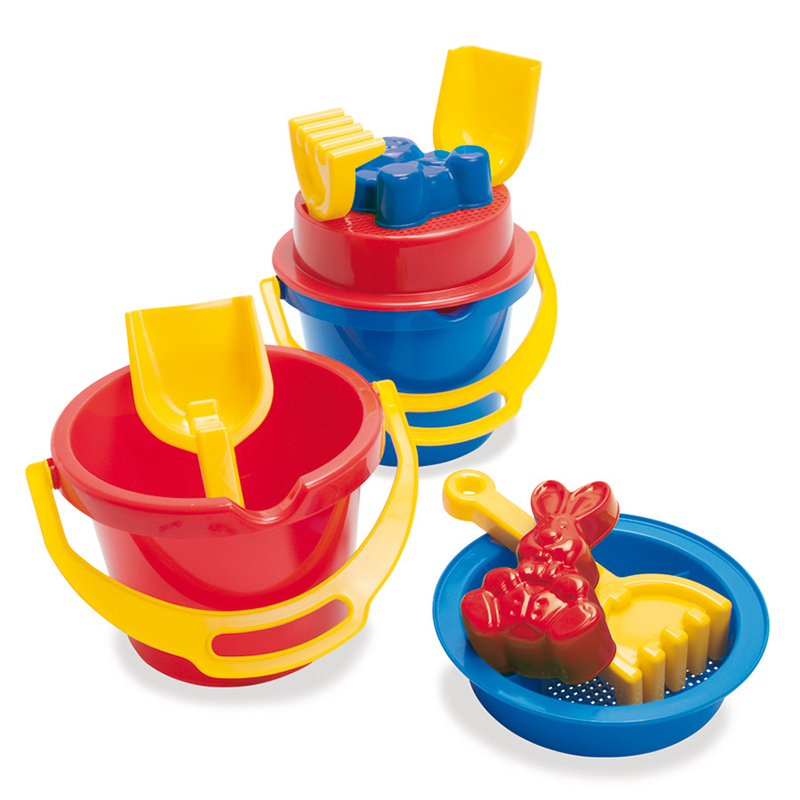 Bộ đồ chơi gồm: 2 xô nhựa, 2 rây cát, 2 cào cát, 2 xẻng xúc, 2 khuôn hình, Đựng trong túi lưới kích thước 23cm x 30cm x 20 cm