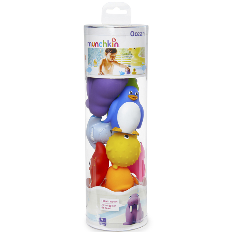 Đồ chơi 8 sinh vật nước ngọt: cá mập, cá ngựa, cá nóc nhím, chim cánh cụt, sao biển... có thể phun nước với màu sắc bắt mắt giúp bé thích thú khi tắm đồng thời tăng sự tương tác giữa bố mẹ và con.