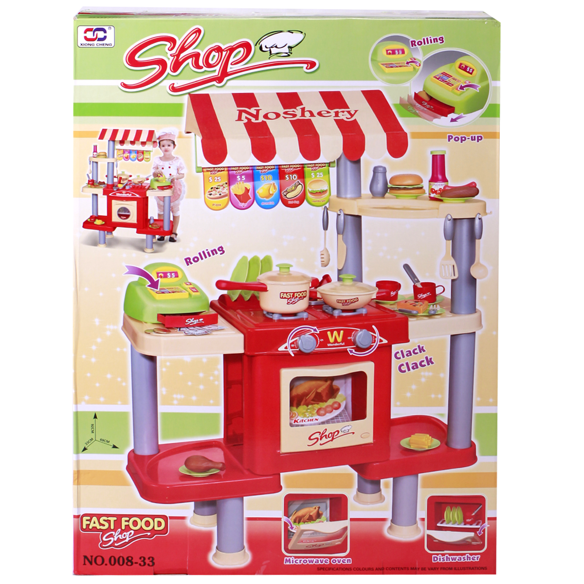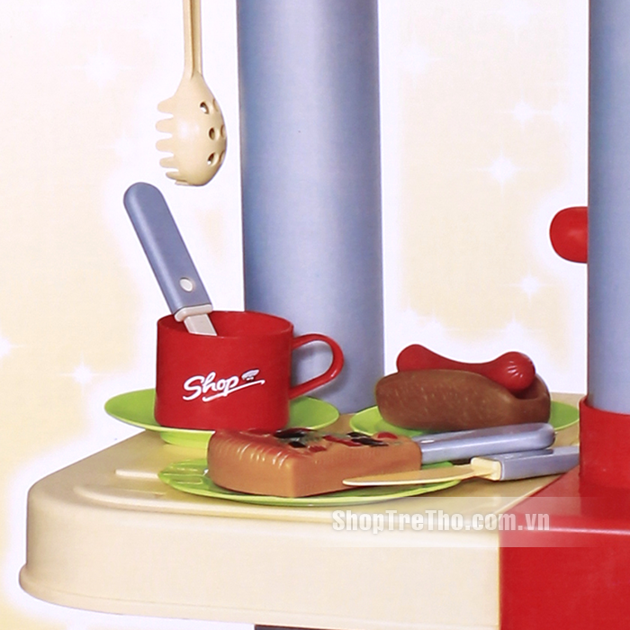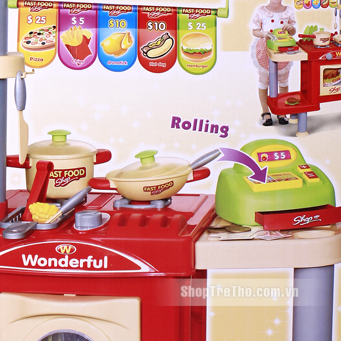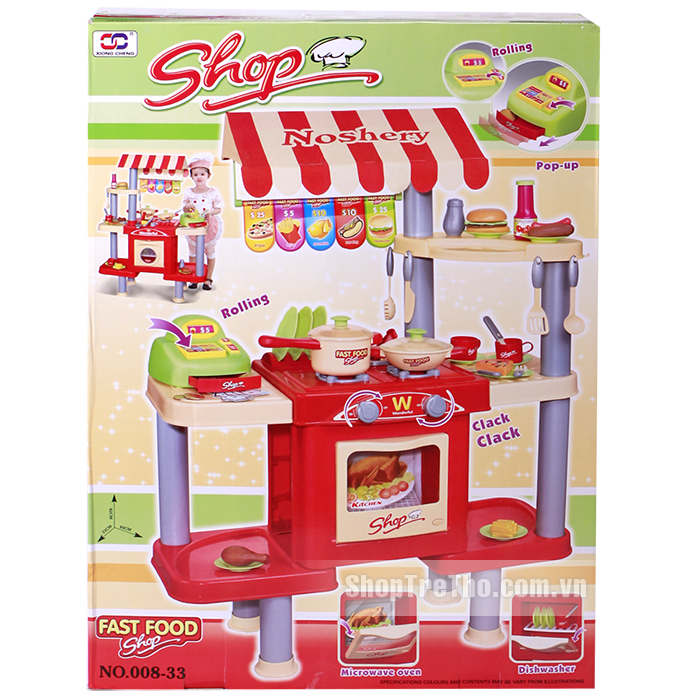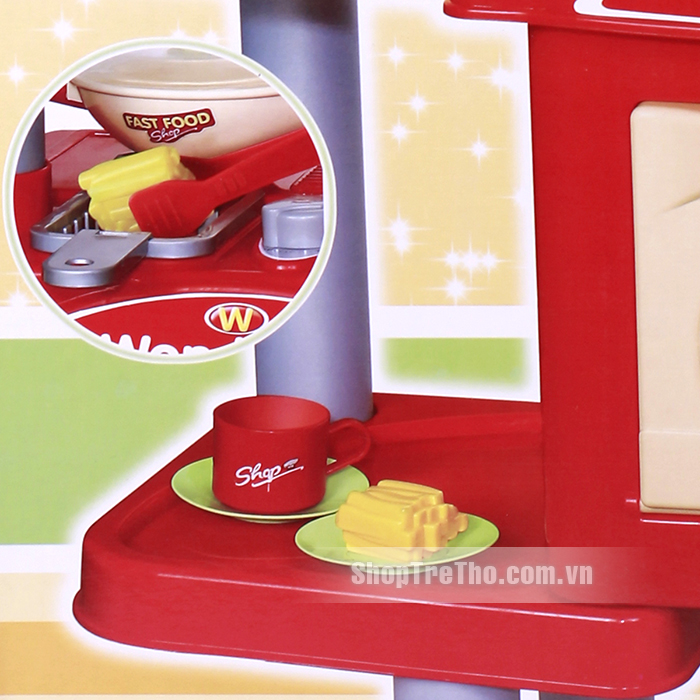 Bộ sản phẩm được thiết kế như một gian bếp chuyên nghiệp giúp bé thỏa sức sáng tạo với đầy đủ dụng cụ cho 1 shop ăn nhanh: bàn, bếp ga, nồi, bát đĩa, cốc, dao, thìa, phô mai, xúc xích…Ngoài ra, bộ đồ chơi tích hợp thêm máy tính tiền giúp bé có thể vừa chơi vừa học một cách thật lý thú và bổ ích.