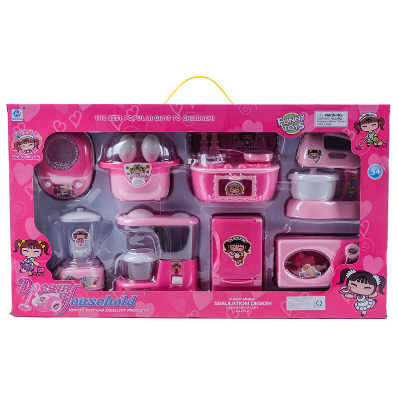 - Bộ sản phẩm gồm 8 dụng cụ: máy pha cafe, máy sinh tố, tủ lạnh, lò vi sóng, máy trộn bột, bếp ga, nồi hấp trứng, máy làm bánh