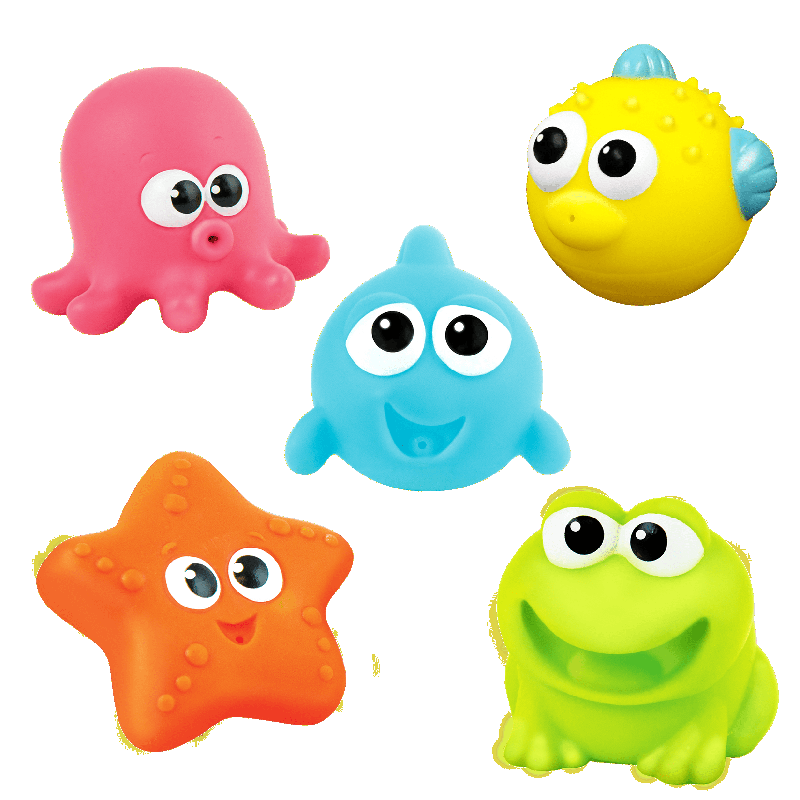 - Bộ nhà tắm gồm 05 chi tiết mô phỏng các sinh vật nhiều màu sắc như: hình sao, bạch tuộc, cá, ếch...
