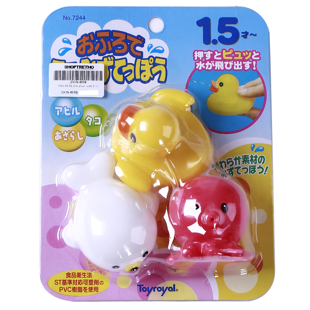 Bộ đồ chơi phun nước 3 trong 1 Toyroyal mô tả ba con vật: chú vịt vàng ngộ nghĩnh, bác bạch tuộc đầu tròn và chú hải cẩu tinh nghịch sẽ là món quà tuyệt vời cho bé vui chơi trong nhà tắm, hay đi bơi cùng gia đình.