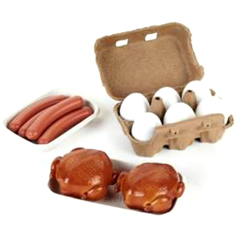 Bao gồm: 4 xúc xích (dài 10cm, rộng 1,7cm) đựng trên khay nhựa trắng 2 con gà tây ( dài 8cm, cao 4cm ) bằng nhựa đựng trong 1 khay trắng,, 1 hộp 6 quả trứng (đường kính 4cm) do hãng Klein (CHLB Đức), sản xuất theo tiêu chuẩn vật liệu và an toàn của Đức.