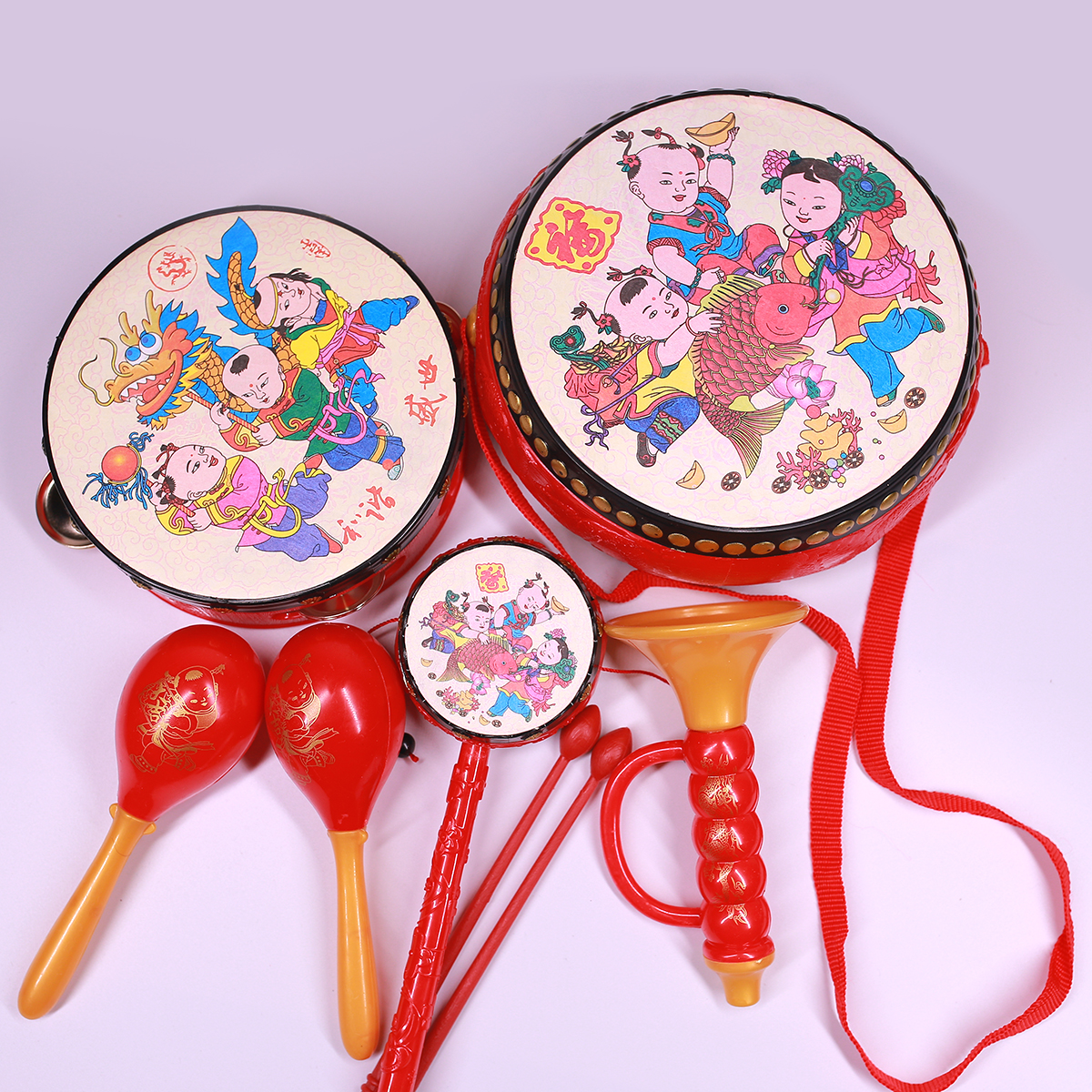- Bộ sản phẩm gồm: trống, trống lắc, có kèm dùi đánh, kèn