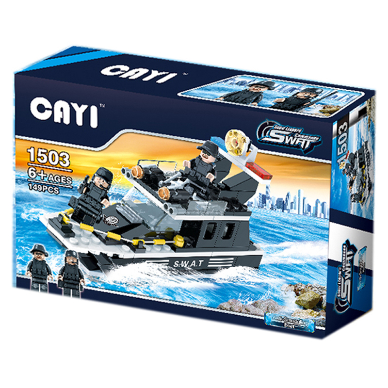 Bộ đồ chơi xếp hình CAYI 1503 gồm 149 miếng ghép nhiều màu sắc, bằng nhựa an toàn, để xe ráp thành chiếc tàu cảnh sát đang đi tuần tra. Đồ chơi lắp ráp giúp bé phát triển trí tuệ, tư duy cũng như khả năng sáng tạo, bé có thể xây dựng nên những câu chuyện của riêng mình.