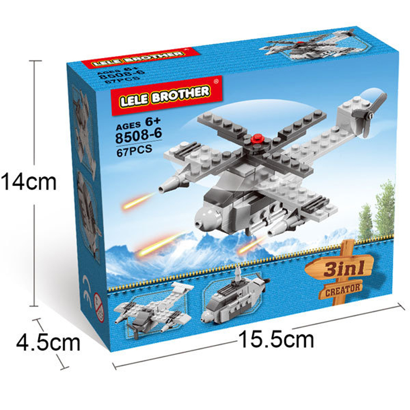 Bộ đồ chơi xếp hình Lele No.8508 - Máy bay 3 in 1 gồm 67 miếng ghép nhiều màu sắc, bằng nhựa an toàn, để bé có thể ráp thành mô hình máy bay các loại. Đồ chơi lắp ráp giúp bé phát triển trí tuệ, tư duy cũng như khả năng sáng tạo, bé có thể xây dựng nên những câu chuyện của riêng mình.