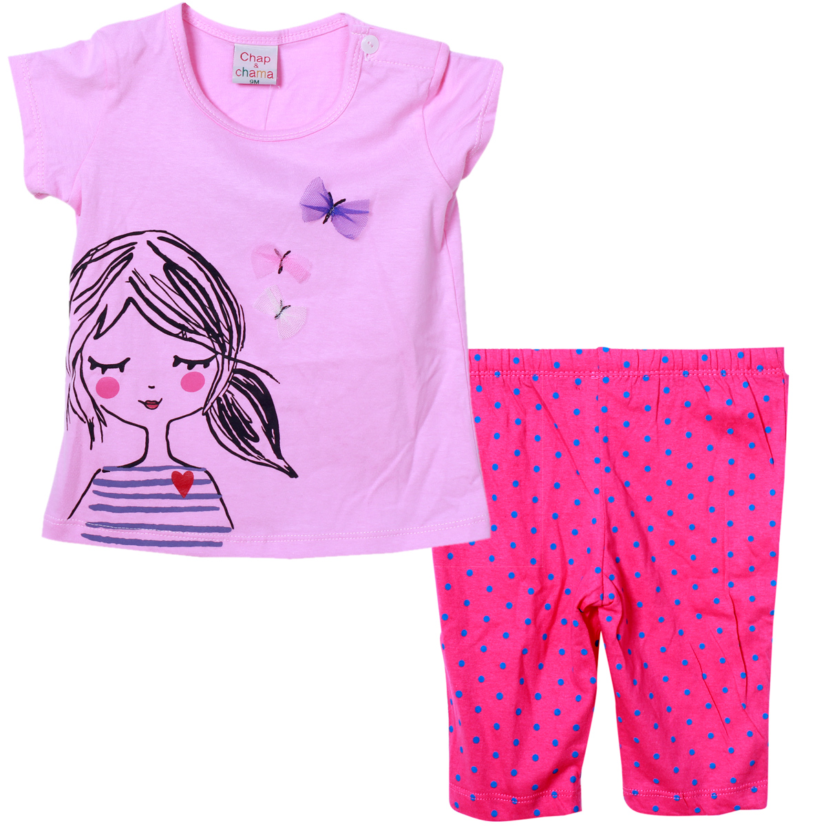 - Bộ đồ với thiết kế in hình ngộ nghĩnh sẽ tăng thêm sự duyên dáng và đáng yêu cho bé. Áo thiết kế cộc tay với họa tiết bé gái ngộ nghĩnh, quần ngố họa tiết chấm bi