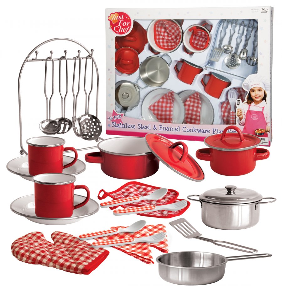 Bộ đồ dùng nhà bếp tiểu thư 26 món tráng men màu hồng thật đáng yêu, giúp bé vừa nấu được những món ăn ngon, lại có thể làm đẹp hơn góc bếp nhỏ của mình. Đặc biệt, trong bộ làm bếp có 1 chiếc giá treo dụng cụ làm bếp, đầy đủ bao tay, nhấc bếp, lại còn có đĩa, thìa và nĩa để sẵn sàng cho bữa ăn. Bộ sản phẩm gồm: 2 nồi tráng men có nắp đậy, 1 nồi inox có nắp đậy, 1 chảo inox, 4 vá, 1 sạn, 1 giá treo vá và sạn, 2 ca tráng men, 2 dĩa tráng men, 2 khăn, 2 tấm nhấc bếp, 1 bao tay, 2 thìa, 2 nĩa.