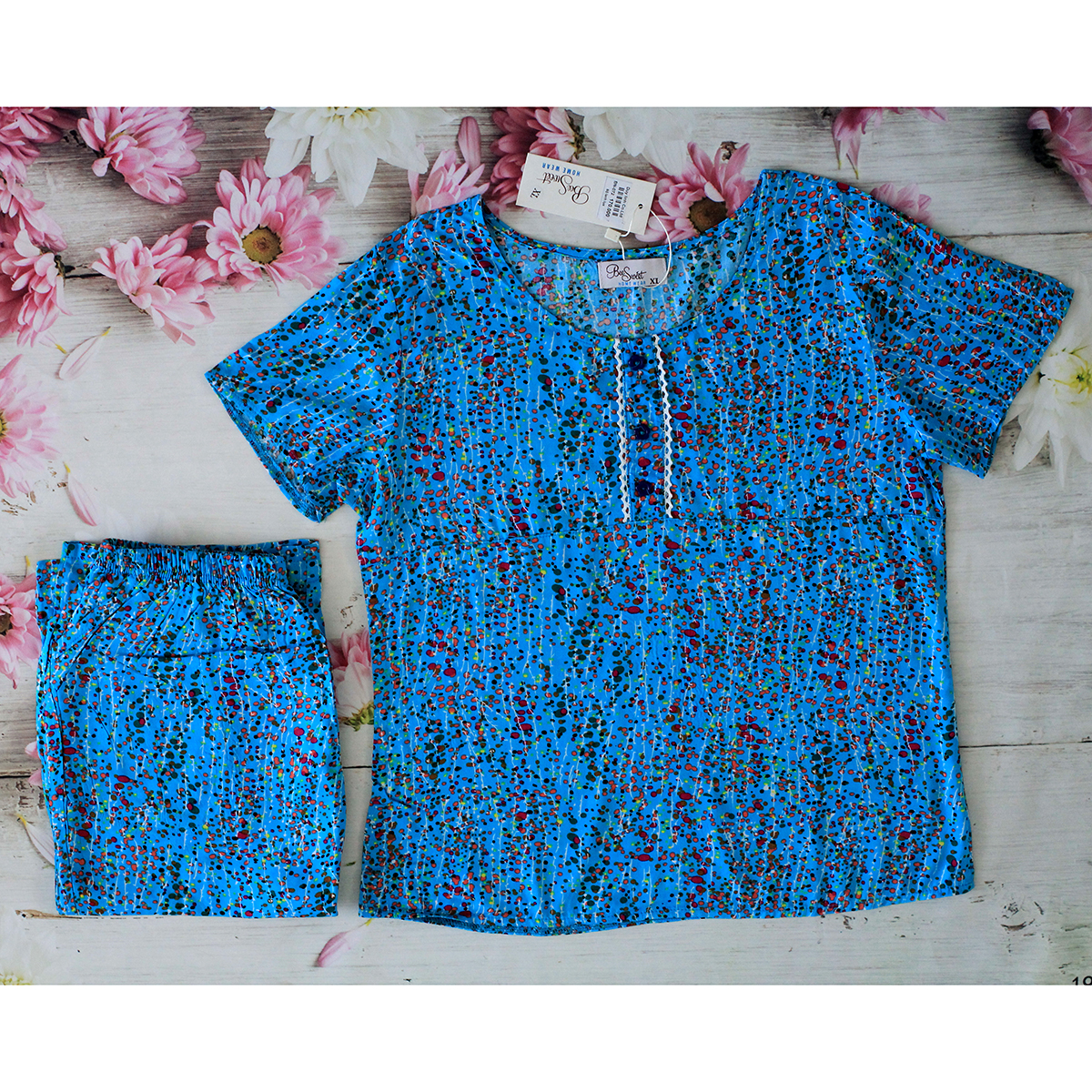 - Thiết kế áo cộc tay khuy mở ở giữa, quần lửng cùng đường may chắc chắn giúp chị em thoải mái vận động mà vẫn kín gió cũng như đảm bảo kín đáo khi nhà có khách