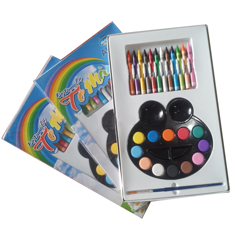 - Sản phẩm gồm 12 cây bút chì sáp, 12 màu nước, 1 cọ vẽ đầy đủ các sắc màu: đỏ, đen, xanh, vàng...