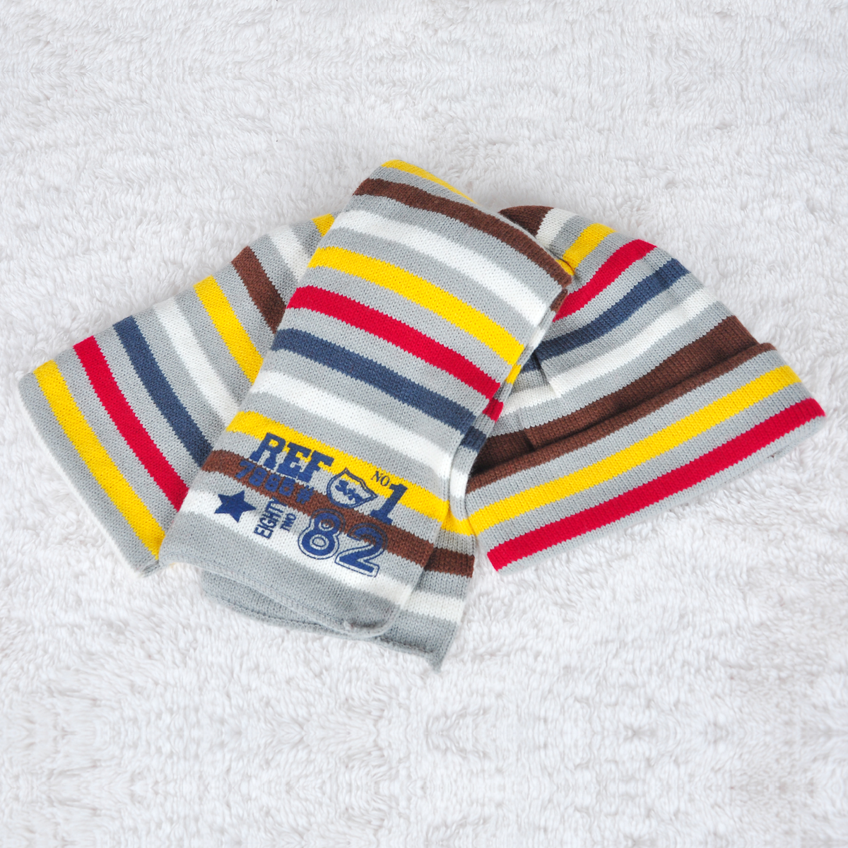 Họa tiết trên khăn và mũ len sặc sỡ rất đẹp cho bé.