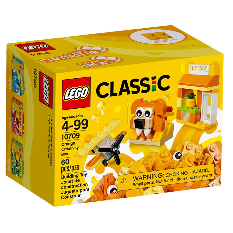 Bộ lắp ráp Lego Classic 10709 bao gồm các miếng ghép cơ bản là những viên gạch đi kèm với đó là những phụ kiện như cửa sổ, cửa ra vào, bánh xe và những đôi mắt để bé có thể lắp ráp theo hướng dẫn hoặc sáng tạo ra các mô hình theo trí tưởng tượng của mình. Tất cả các chi tiết đều bằng nhựa ABS an toàn với tông màu cam là chính.