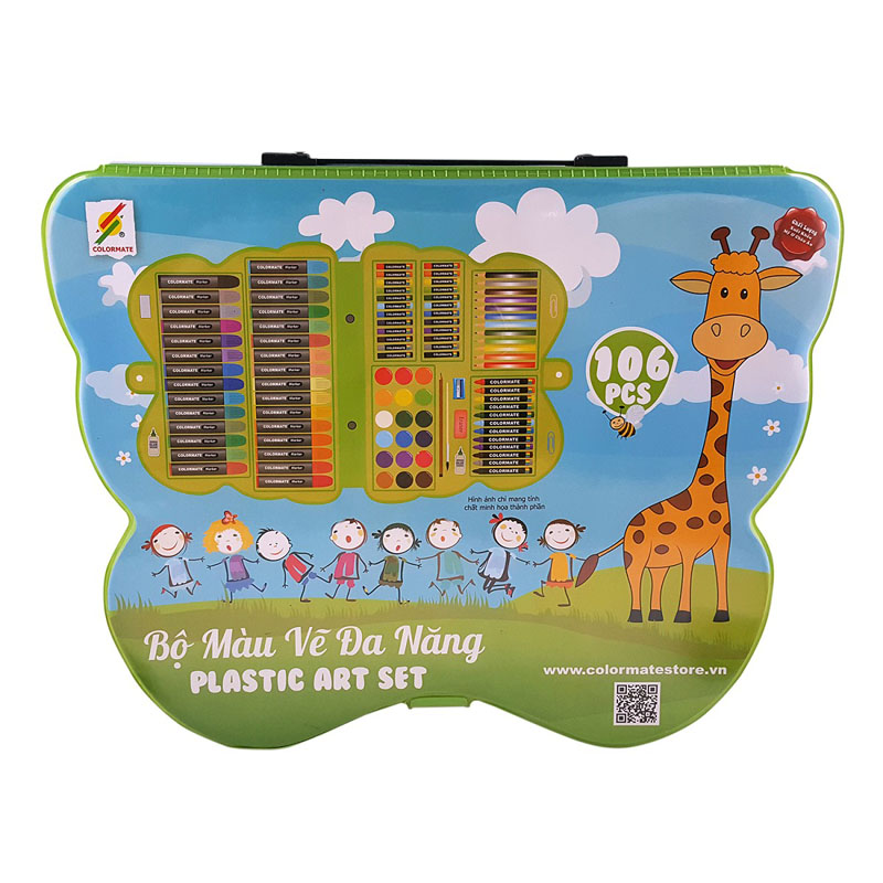 Bộ màu vẽ đa năng Colormate 106PLS bao gồm nhiều loại màu khác nhau như: chì màu, sáp màu, bút lông, kéo và thước, giúp các bé thỏa thích sáng tạo khi tô vẽ. Sản phẩm được đóng trong hộp nhựa tiện lợi giúp bé dễ dàng cất bút khi không sử dụng tới hoặc mang theo để vẽ khi đi dã ngoại, cắm trại...