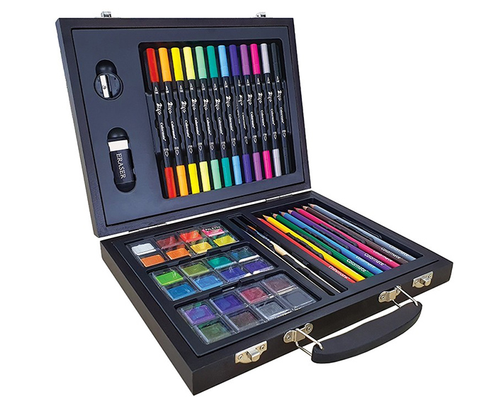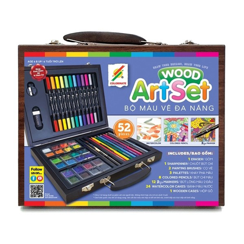 Bộ màu vẽ hộp gỗ Colormate MS-52W gồm các loại bút màu như: sáp màu, sáp dầu, bút lông, bút chì màu...đạt tiêu chuẩn ASTM-D4236 (tiêu chuẩn Mỹ), EN-71 (tiêu chuẩn châu Âu), đảm bảo an toàn cho trẻ trên 3 tuổi khi học và chơi. Sản phẩm được đựng trong hộp gỗ tiện lợi cho bé để trong cặp mang theo đi học hoặc sử dụng ở nhà. Thiết kế phù hợp với tay trẻ nhỏ, giúp bé dễ dàng cầm nắm, tạo sự thoải mái tối đa nhất, không gây mỏi tay khi vẽ.