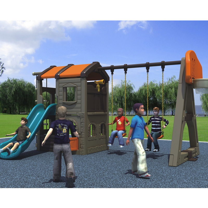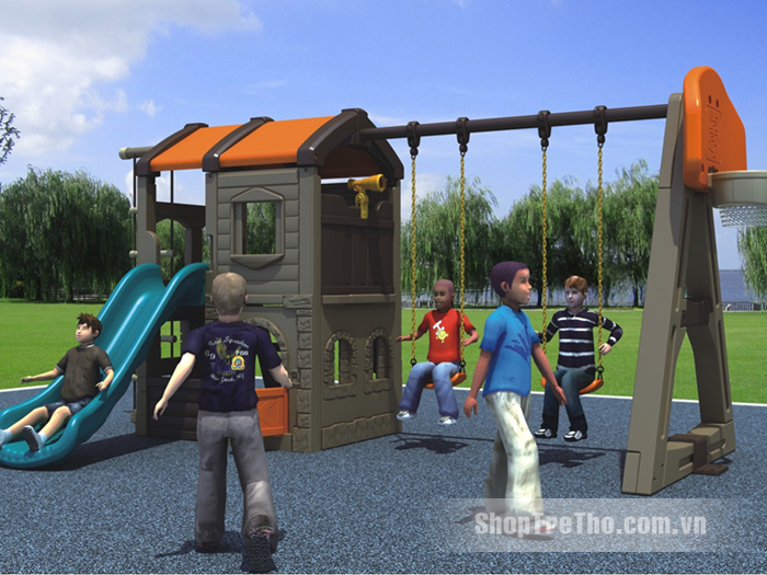 - Bộ sản phẩm gồm: 1 nhà cầu trượt, 1máng trượt, 2 xích đu, cây chơi bóng rổ