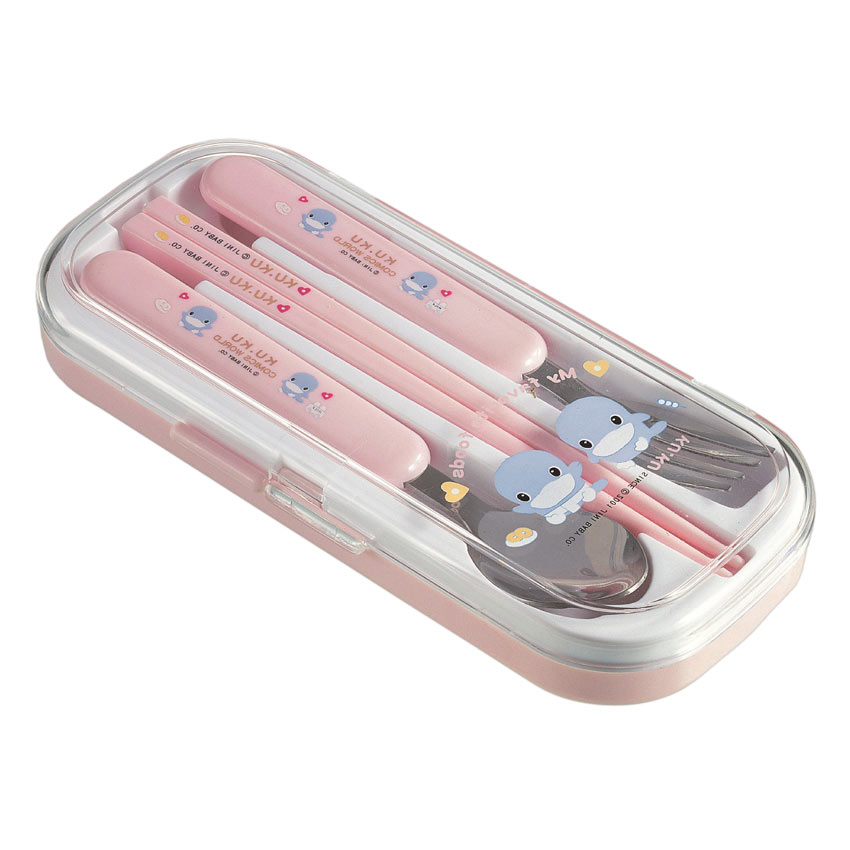 Bộ sản phẩm gồm có muỗng, nĩa và đũa giúp bé làm quen với mọi cách cầm nắm các dụng cụ ăn.