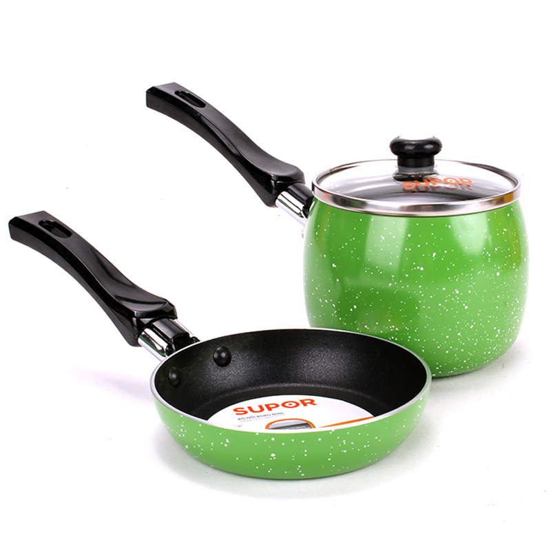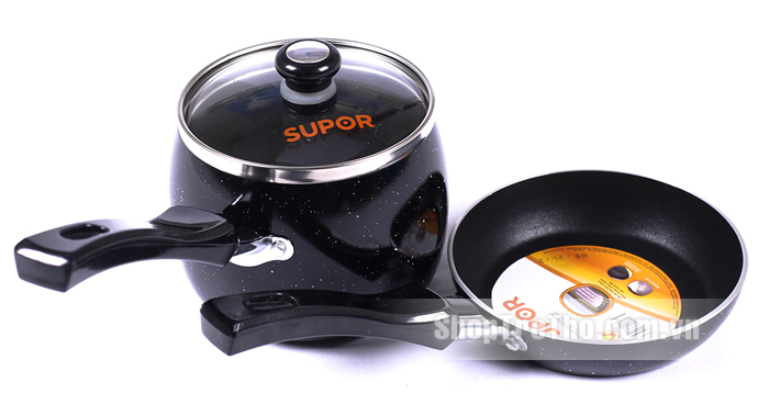 - Bộ sản phẩm nồi nấu bột Supor T0305 gồm 1 nồi đường kính 10cm, có vung kính kèm theo và 1 chảo đường kính 12cm.
