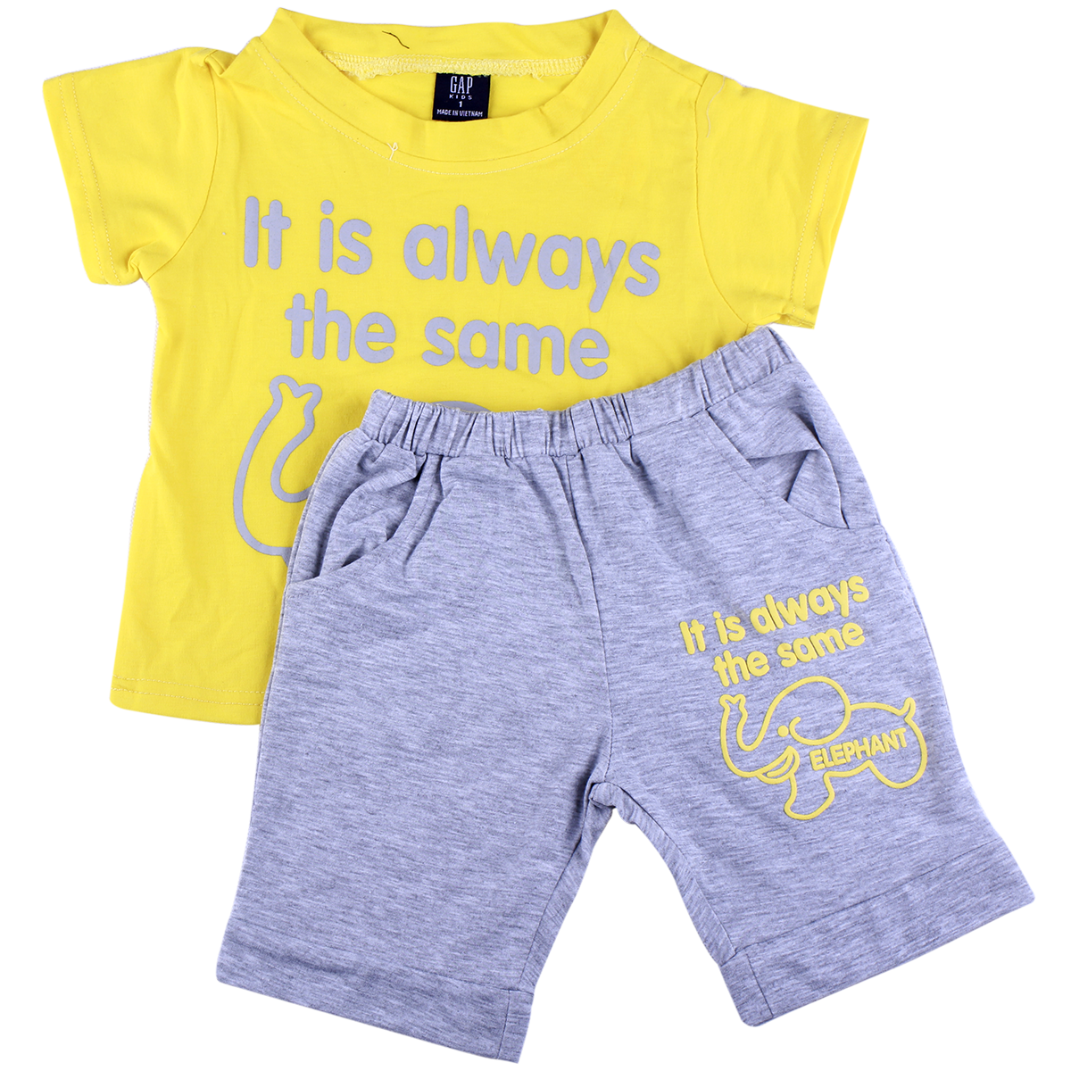 Bộ quần áo bé trai Gap gồm 1 áo cộc tay in hình chú voi kết hợp với quần lưng thun, màu sắc nổi bật, tạo nên phong cách khỏe khoắn, năng động cho bé.