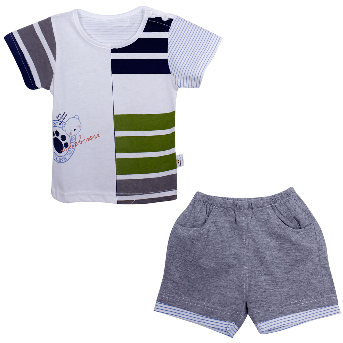 Bộ quần áo cộc tay (1-3T) được may bằng chất vải cotton thấm hút mồ hôi, cho bé thoải mái vận động. Áo cộc tay có khuy cài vai giúp bé dễ dàng mặc đồ mà không làm trẻ khó chịu vì bị vướng đầu do cổ áo chật. Quần chun với gam màu tối kết hợp áo họa tiết sọc ngang sẽ mang đến phong cách khỏe khoắn, thời trang cho bé yêu của bạn.