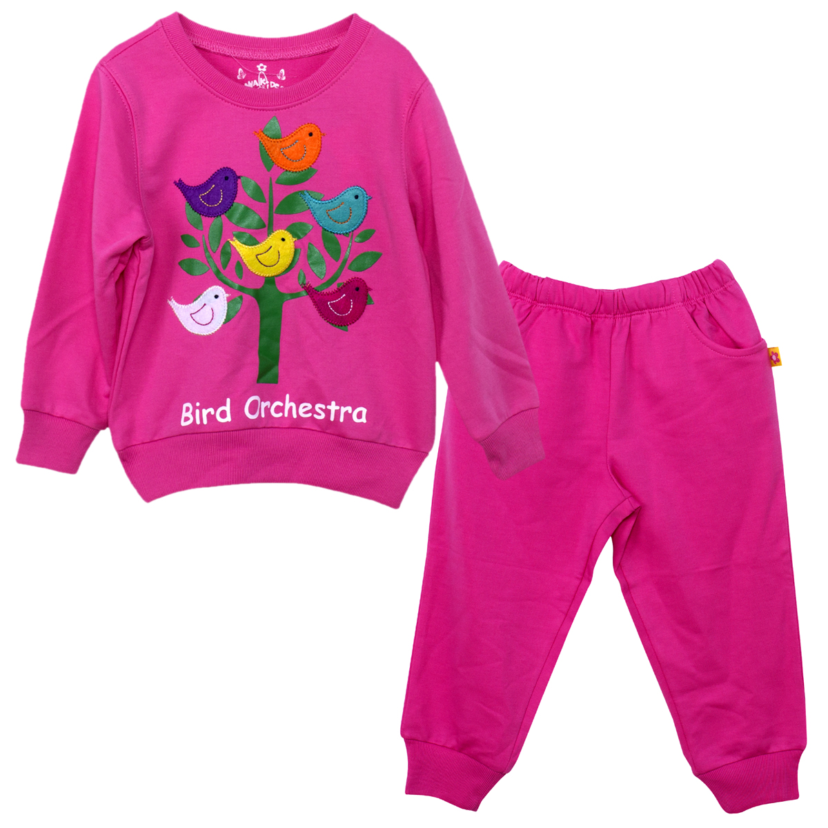 - Bộ quần áo bé gái với điểm nhấn họa tiết hình cây với những chú chim màu sắc sẽ khiến bé vô cùng thích thú khi diện bộ đồ này.
