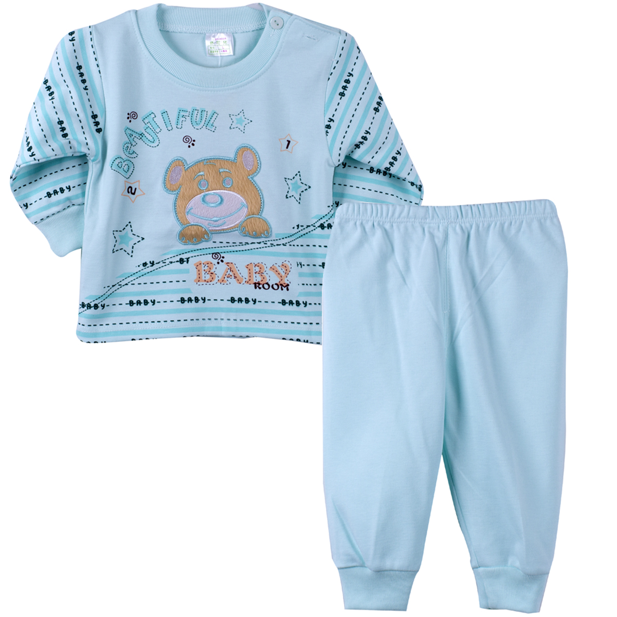 - Kiểu dáng quần dài, lưng thun, áo cổ tròn, dài tay, bo gấu giúp bé giữ ấm hiệu quả.