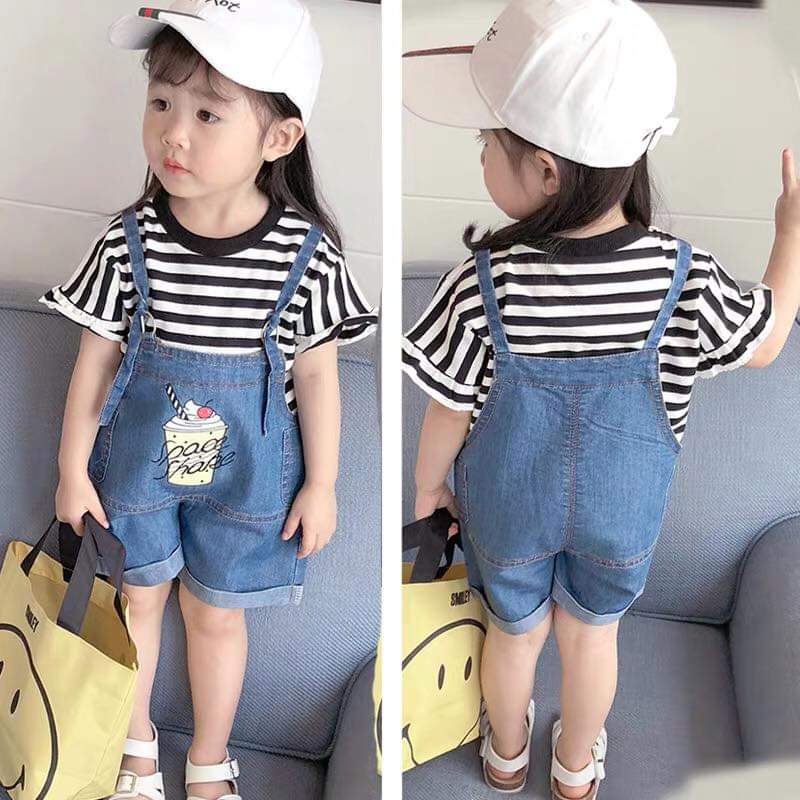 - Kiểu quần yếm với hình cốc kem tăng thêm nét ngộ nghĩnh cho bé, áo phông kẻ sọc dễ phối hợp đồ