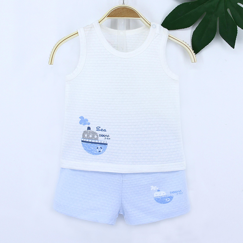 Bộ sơ sinh ba lỗ bé trai Dokma DB242 (trắng xanh) được may từ vải cotton organic luôn giữ vững các ưu điểm thông thoáng, mềm mại, đàn hồi tốt và không bai xù qua nhiều lần giặt. Kiểu quần áo ba lỗ phù hợp cho các bé trai mặc vào thời tiết mùa hè oi nóng.