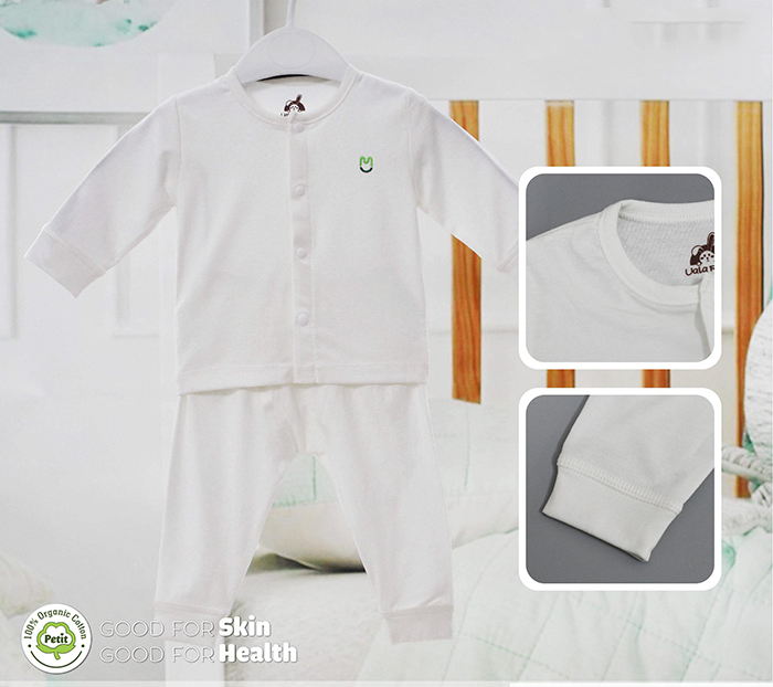 - Bộ quần áo được may từ vải 100% Organic cotton (Cotton hữu cơ) là loại bông không sử dụng thuốc trừ sâu, hóa chất, thuốc tẩy, thuốc nhuộm màu hay kim loại nặng. Nổi bật với các đặc tính:
