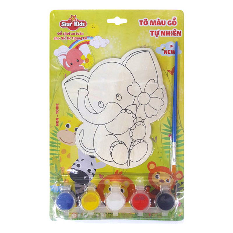Bộ tô màu gỗ tự nhiên Star Kids K202 gồm 1 hình chú voi con bằng gỗ, 1 cọ vẽ và 5 màu cơ bản để bé có thể tự mình hoàn thiện bức tranh. Sản phẩm được làm từ gỗ tự nhiên, giúp bé rèn luyện kỹ năng tô màu, tập tính cẩn thận và hoàn thành tốt công việc, đồng thời bé có thể phát huy khả năng sáng tạo khi kết hợp nhiều màu khác với nhau.